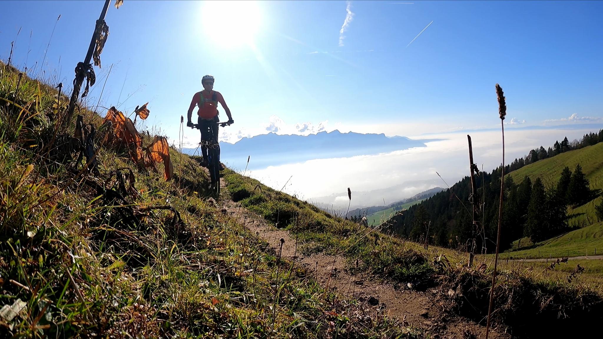 On poursuit en direction de vallon d'Orgevaux et au niveau de l'alpage la Forcla on prend le petit single qui traverse la forêt. C'est un peu technique jusqu'à la crète qui offre une vue splendide sur le Léman... ensuite le chemin descend pour rejoindre la petite route au niveau de Plan de Châtel. Et là c'est plus que de la descente jusqu'à notre point de départ.