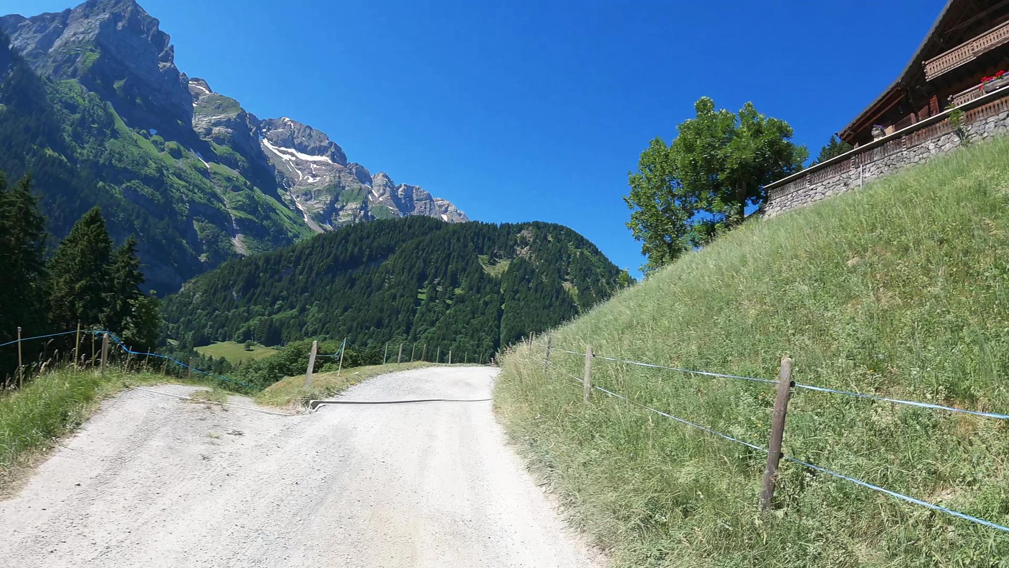 On entre alors dans l'étroit vallon de Barme, sur une route pierreuse très pentue qui finalement rejoint la route du Grand Paradis puis Champéry.
